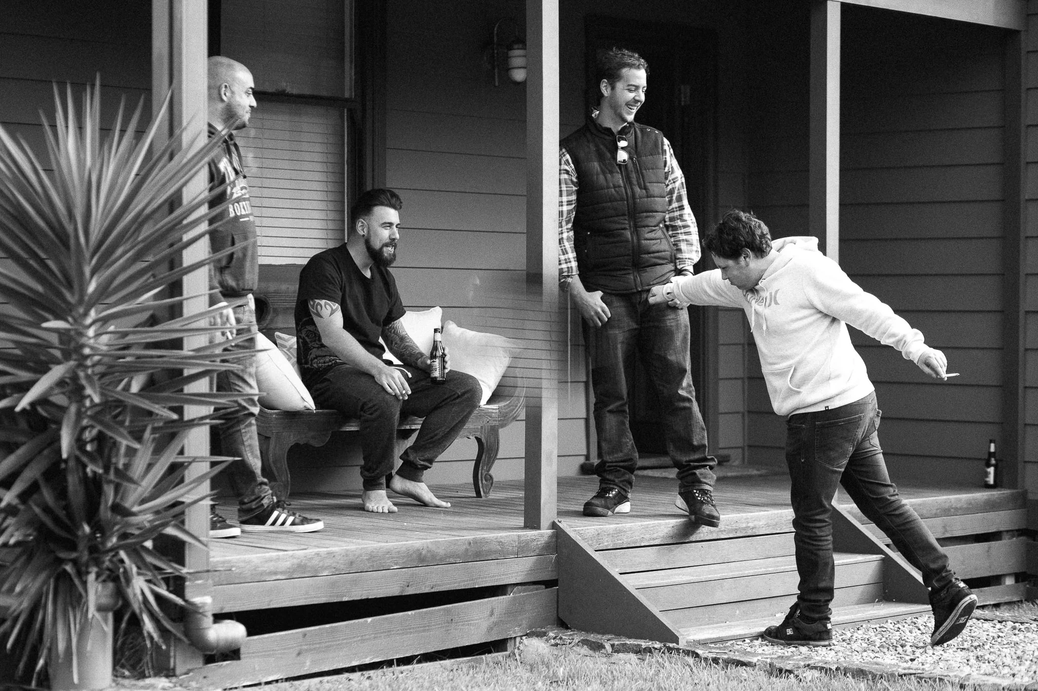 Four young men socializing on a front porch: one sitting on a bench holding a beer, another sitting on the bench, and two standing, one of whom is stretching or dancing.