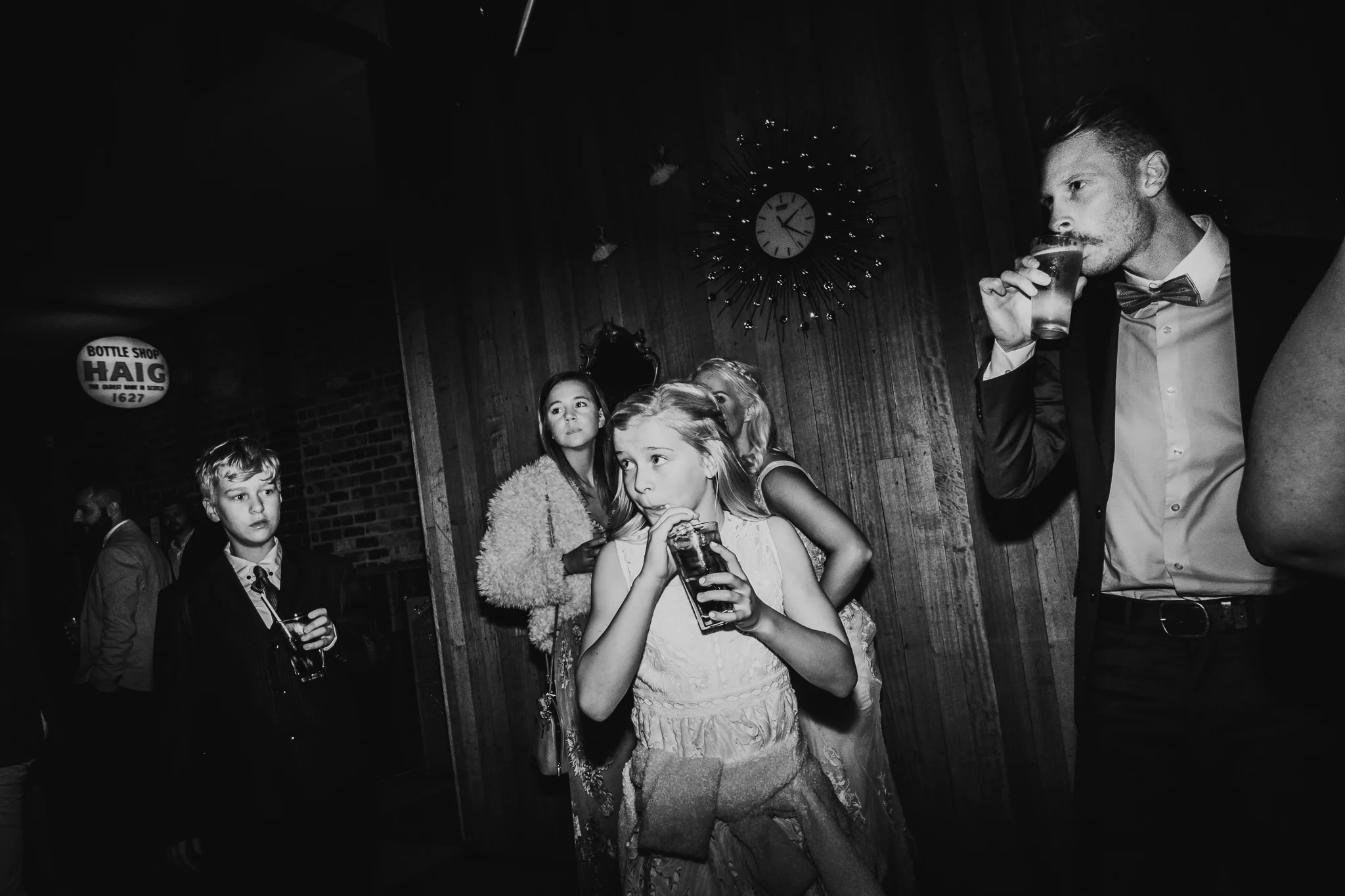 People celebrating at a wedding reception, sitting at a table with drinks, flowers, and candles, in a dimly lit room. Inner city melbourne wedding.
