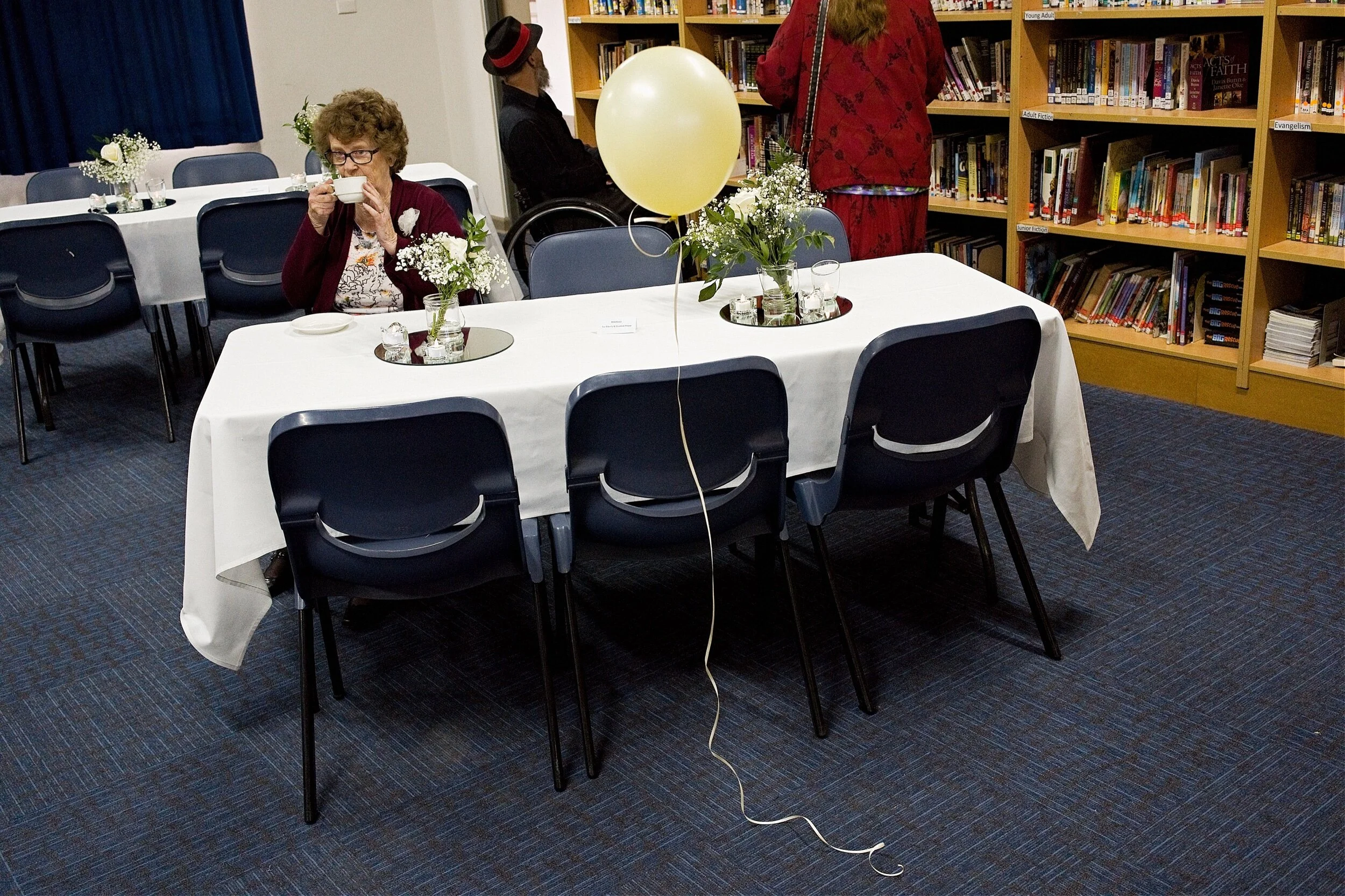 A library room decorated for a celebration with tables, white tablecloths, and floral centerpieces. One woman is sitting at a table drinking from a cup, and another woman in a red shirt stands with her back to the camera near a bookshelf. There's a y View fullsize