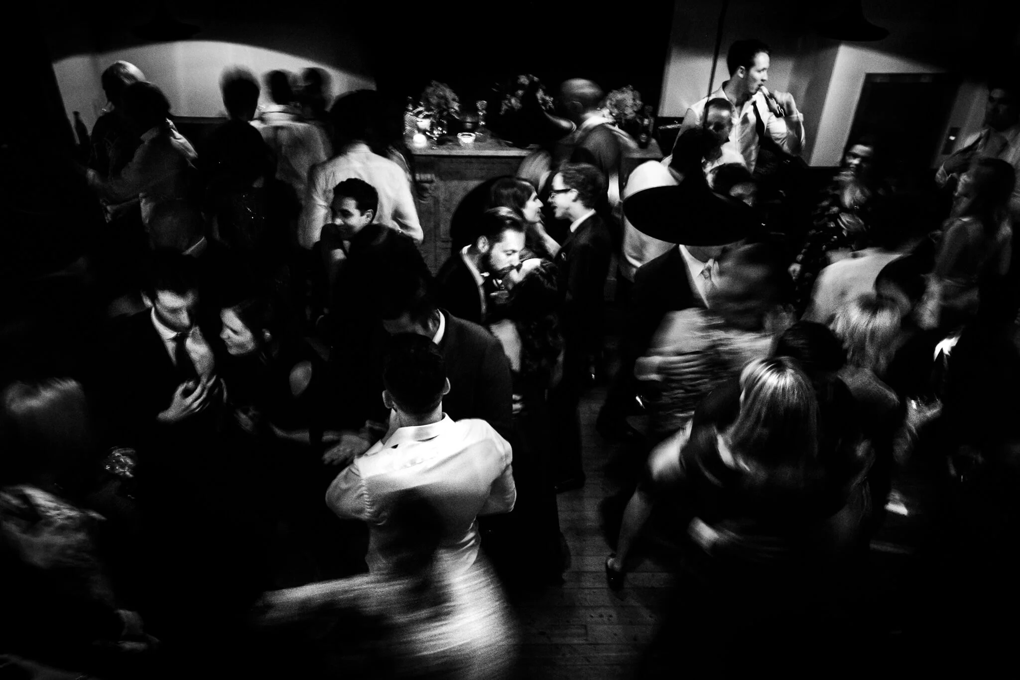 Black and white photo of a crowded dance floor with people dancing, talking, and socializing at a party. View fullsize